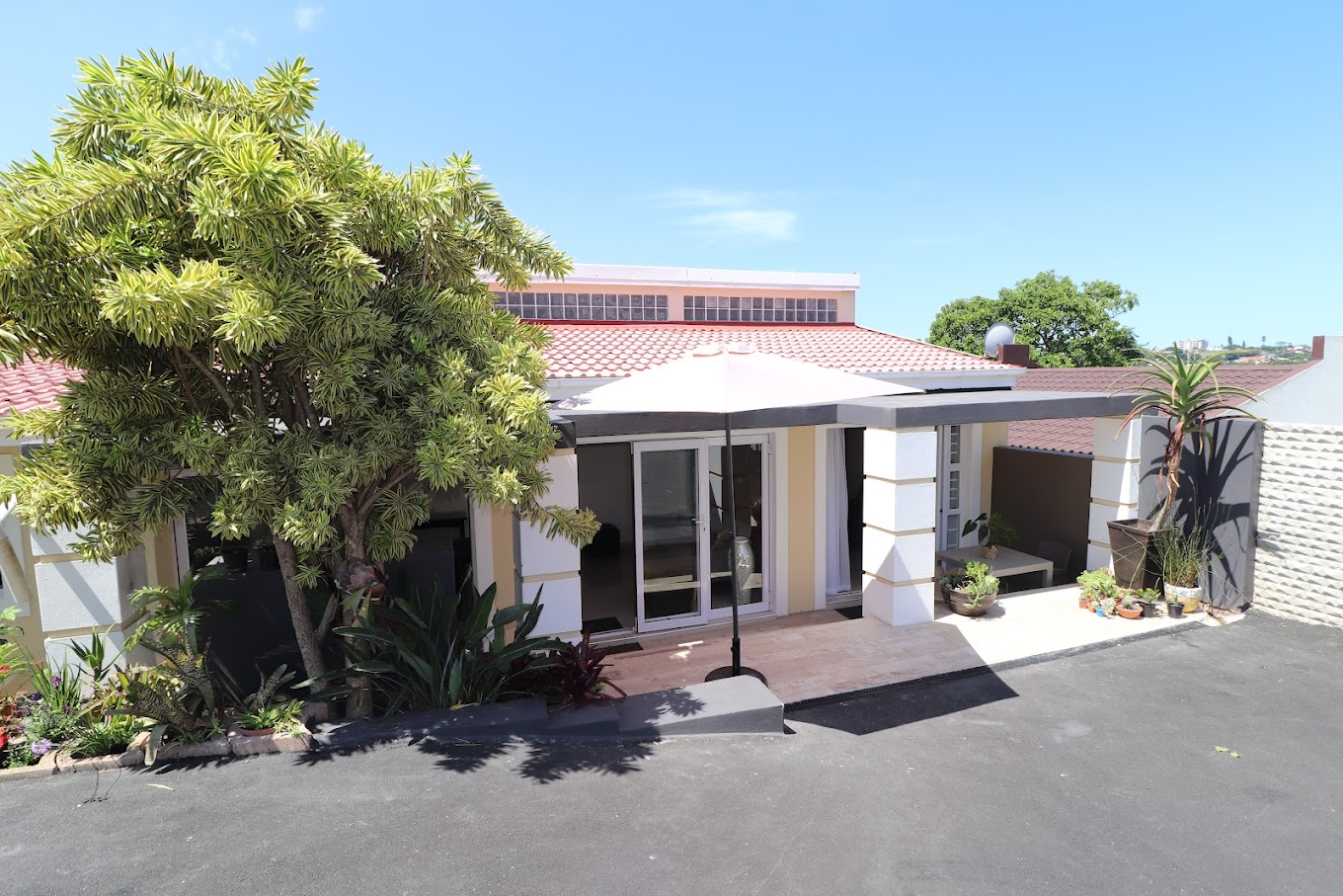 The guesthouse is designed to provide a serene and relaxing environment. It features stylish and modern rooms with plush bed linen, large glass bathrooms, and comfortable walk-in showers. Some rooms even have a soaking tub for extra relaxation. Guests can enjoy the garden, which is perfect for lounging with a glass of wine after a busy day exploring Durban.